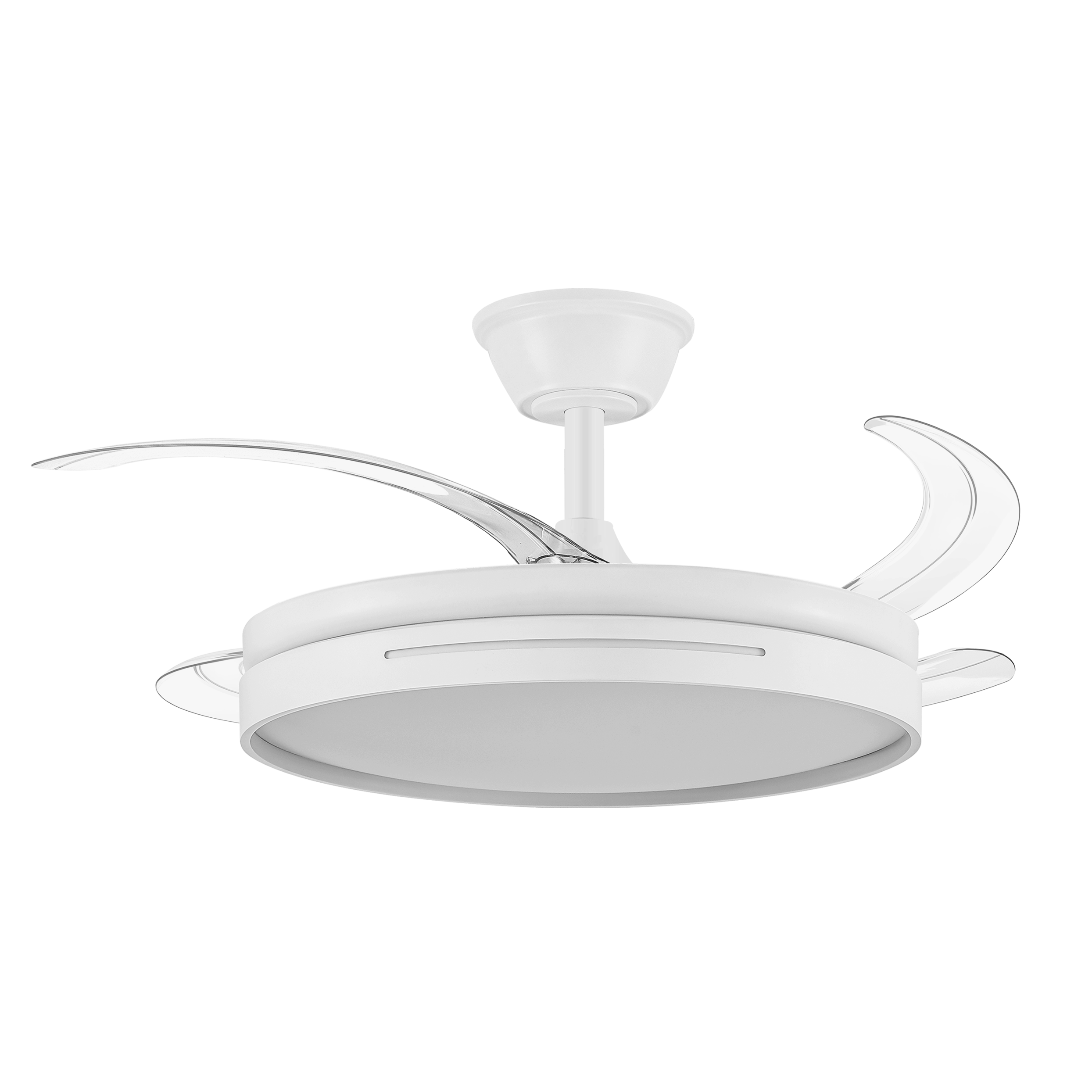 El diseño del Micenas es una declaración de minimalismo funcional. Su estructura principal está fabricada en metal blanco, garantizando estabilidad y durabilidad, mientras que los componentes secundarios y las aspas utilizan ABS y policarbonato, materiales ligeros pero de alta resistencia al impacto. La estética se completa con las cuatro aspas transparentes que, al desplegarse, crean un diámetro de 106 cm, pero que se ocultan en un perfil compacto de solo 50 cm de diámetro cuando están plegadas, integrándose visualmente en el techo.